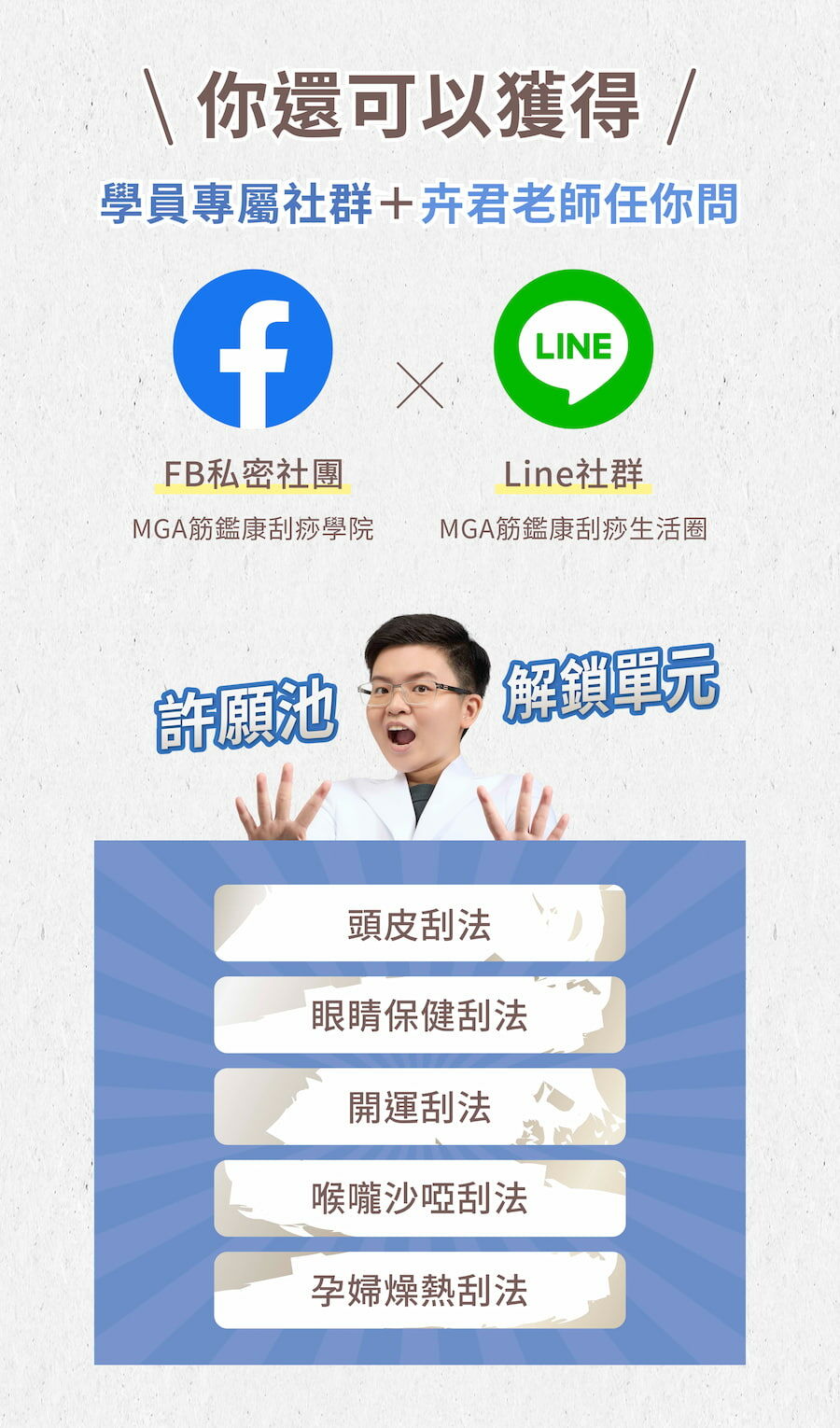 凡購買MGA刮痧商品的刮友,都可以加入『產品使用教學影片』平台中,且會不定期更新(QRcode會在產品包裝盒上)