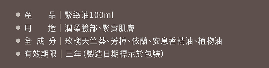 全成分:玫瑰天竺葵、芳樟、依蘭、安息香精油、植物油