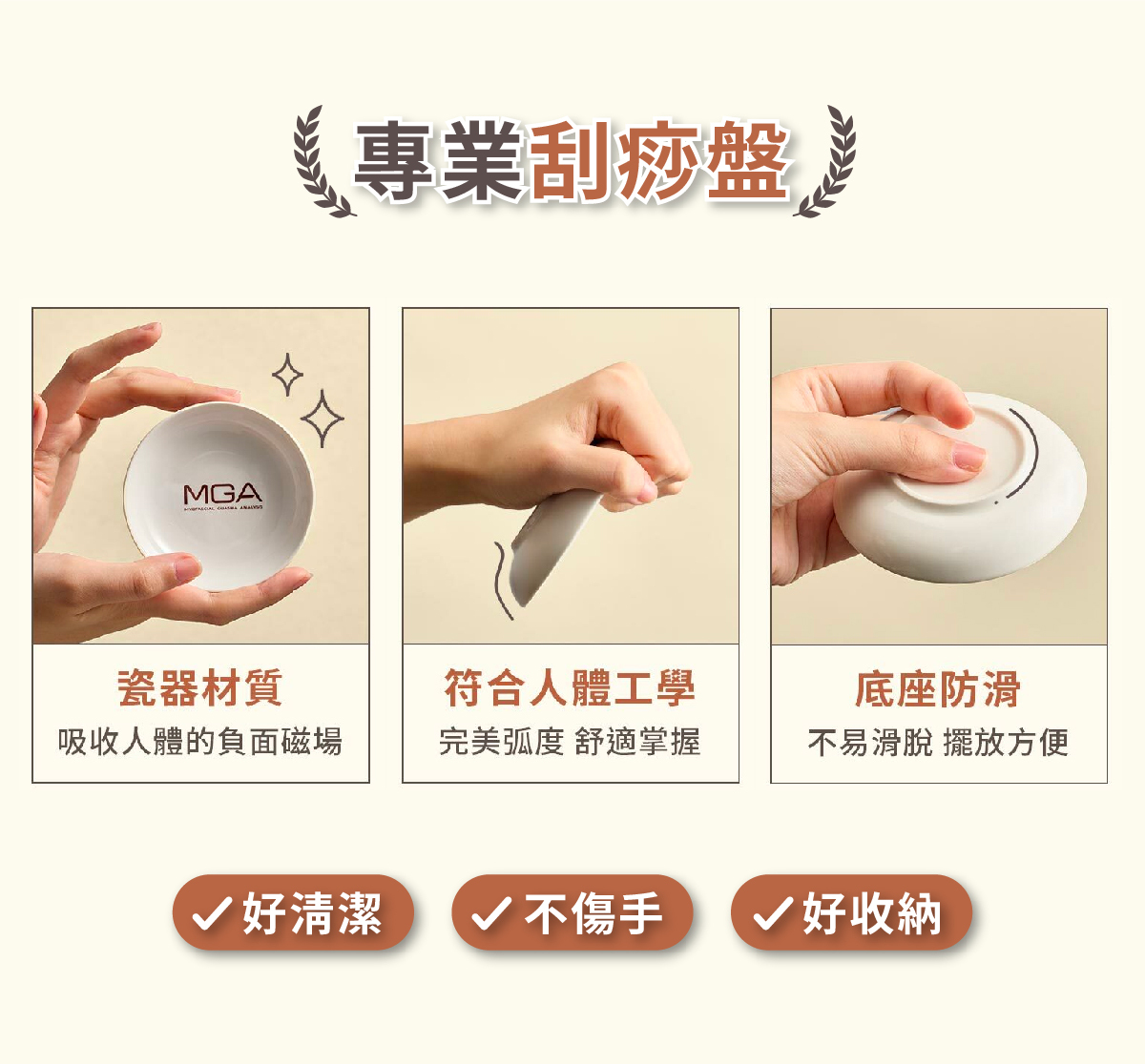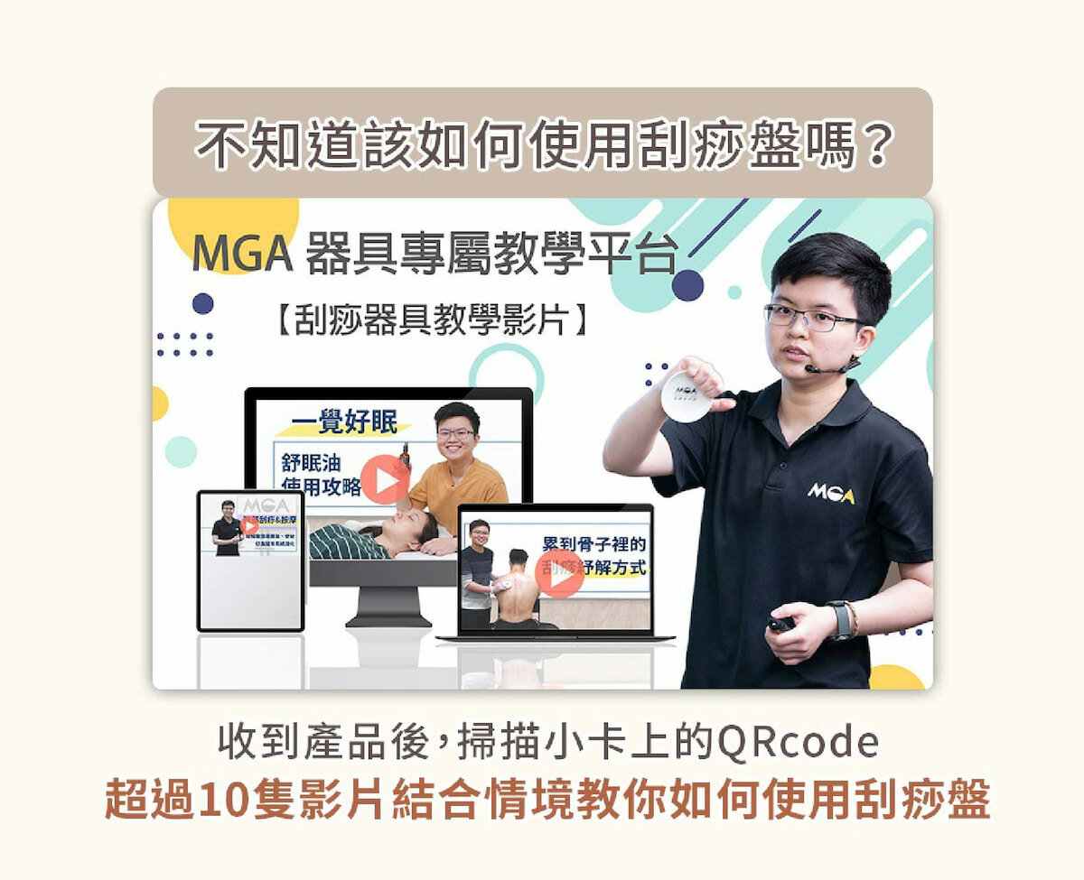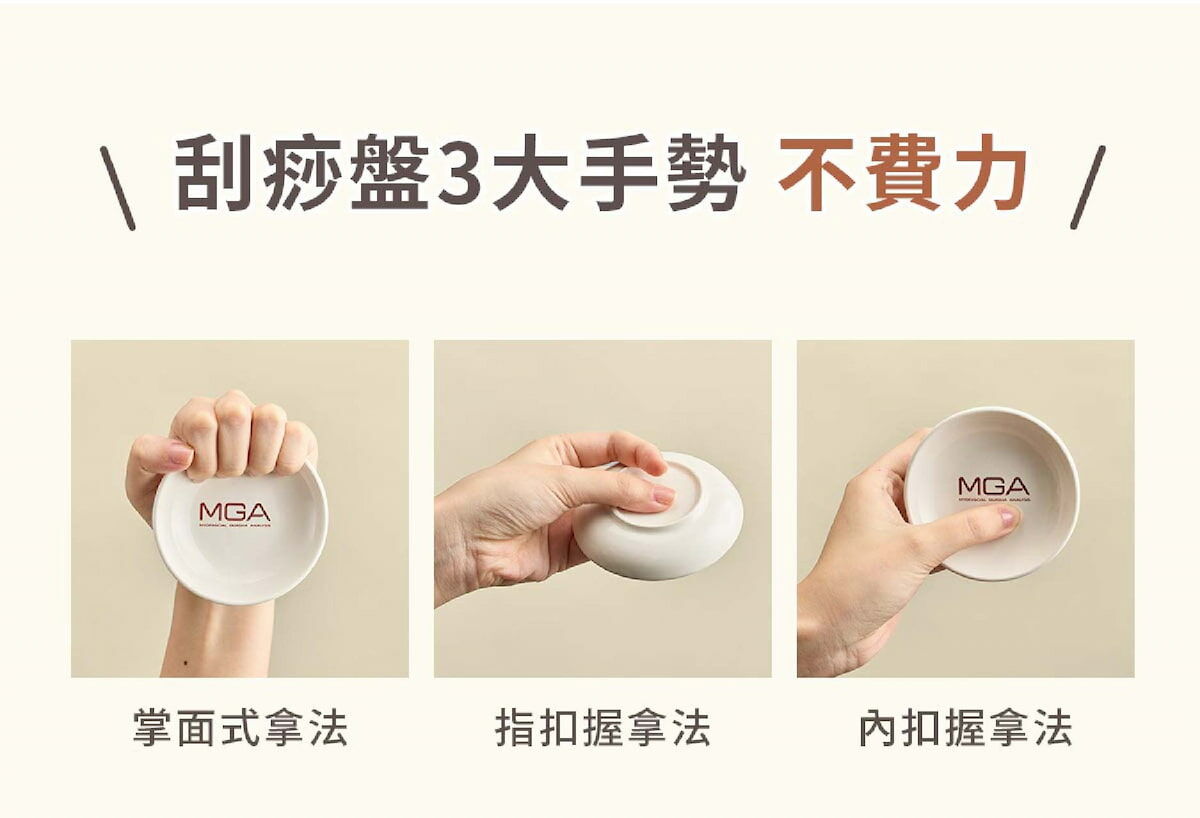 事實上,在MGA系統裡,透過正確的器具(刮痧盤)及介質(刮痧油),慢慢刮拭身體,進而讓「痧」浮現,才是真正的刮痧。