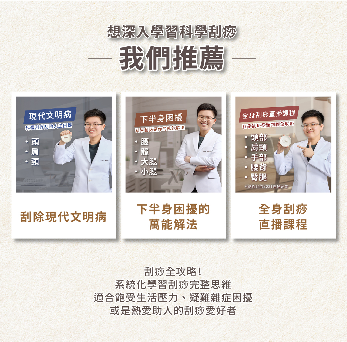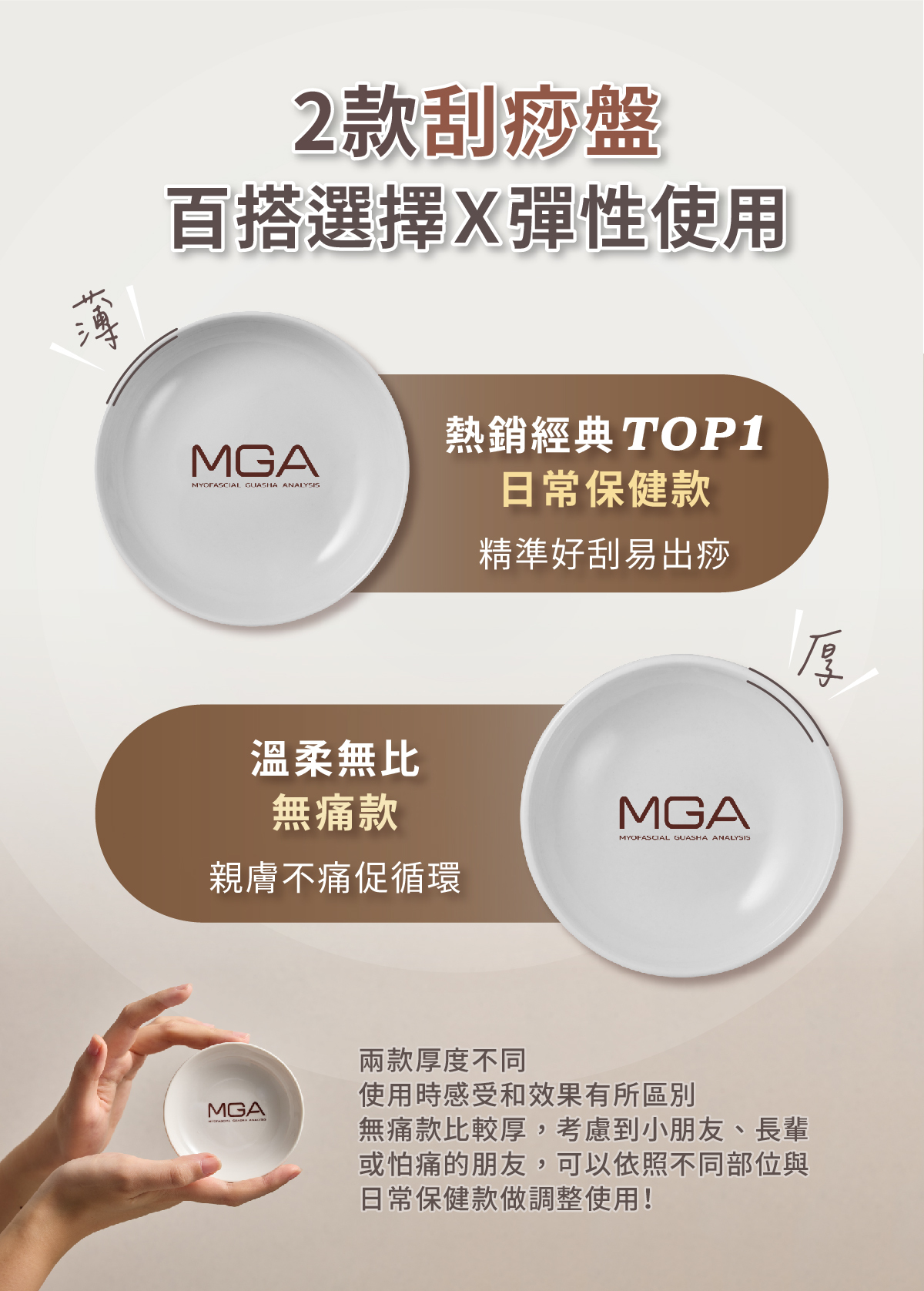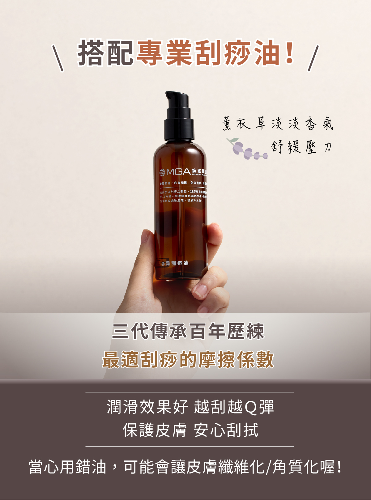 事實上,在MGA系統裡,透過正確的器具(刮痧盤)及介質(刮痧油),慢慢刮拭身體,進而讓「痧」浮現,才是真正的刮痧。