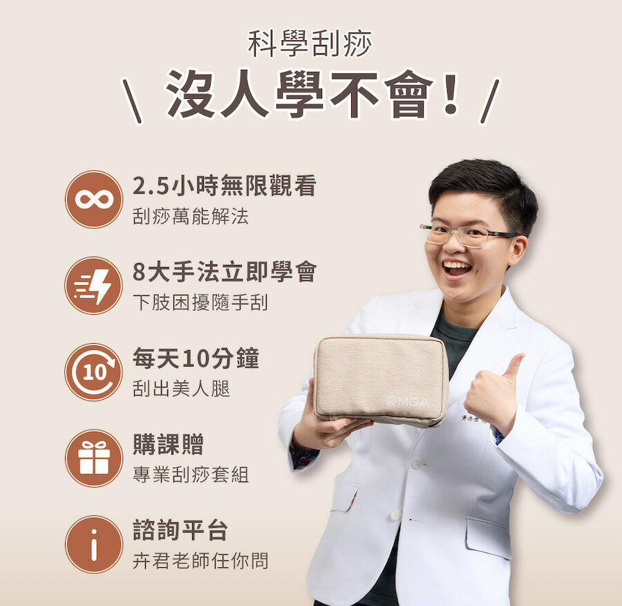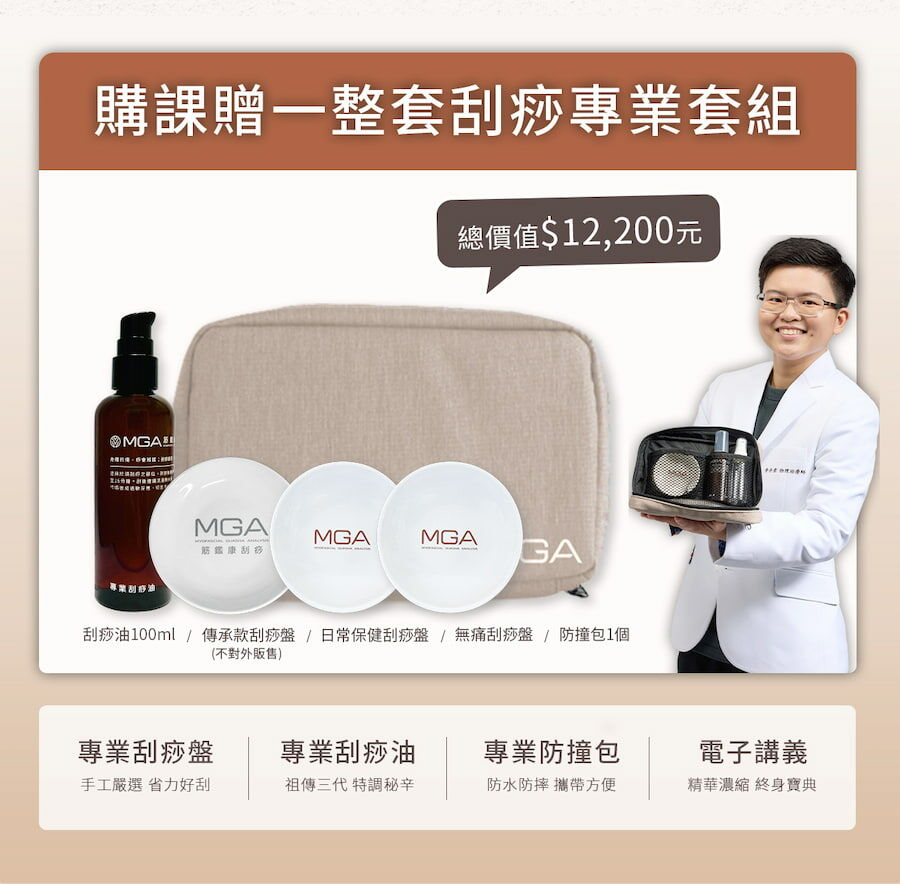 2.購課附贈:傳承刮痧盤+日常保健刮痧盤+無痛刮痧盤+100ml刮痧油+刮痧專業防撞包+電子講義(總價值$12,200)
